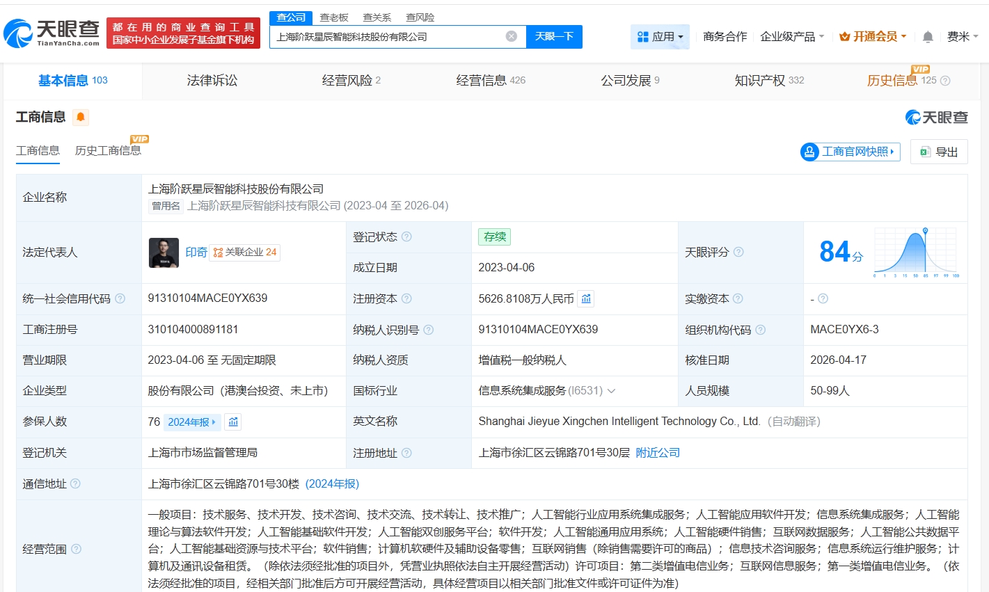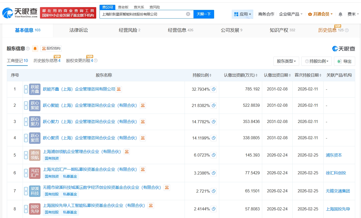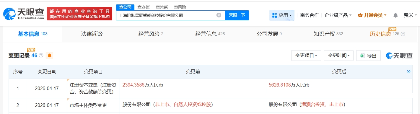 每經(jīng)AI快訊,天眼查App顯示,近日,上海階躍星辰智能科技股份有限公司發(fā)生工商變更,注冊(cè)資本由約2394萬元人民幣增至約5627萬元人民幣,增幅約135%。該公司成立于2023年4月,法定代表人為印奇,經(jīng)營(yíng)范圍包括人工智能行業(yè)應(yīng)用系統(tǒng)集成服務(wù)、人工智能應(yīng)用軟件開發(fā)、人工智能理論與算法軟件開發(fā)等,由躍能齊鑫(上海)企業(yè)管理咨詢有限公司、躍心聚能(上海)企業(yè)管理咨詢合伙企業(yè)(有限合伙)、躍心聚力(上海)企業(yè)管理咨詢合伙企業(yè)(有限合伙)等共同持股。
