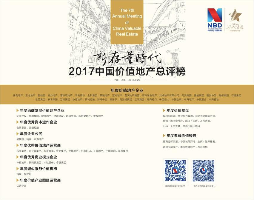 中國價值地產(chǎn)總評榜 2017中國價值地產(chǎn)總評榜“頒獎活動將與2017年9月26日的第七屆中國價值地產(chǎn)年會同日舉行,旨在給予地產(chǎn)行業(yè)企業(yè)、項目以公正、客觀的評價,并對優(yōu)秀企業(yè)及項目授予榮譽。 中國價值地產(chǎn)總評榜評選體系以總積分制排名,將第三方數(shù)據(jù)、上市公司市值、活躍指數(shù)、輿情、社會價值等方面進行綜合評價,充分考慮每一家地產(chǎn)企業(yè)的價值呈現(xiàn),為行業(yè)的價值規(guī)范提供有效的指標(biāo)。