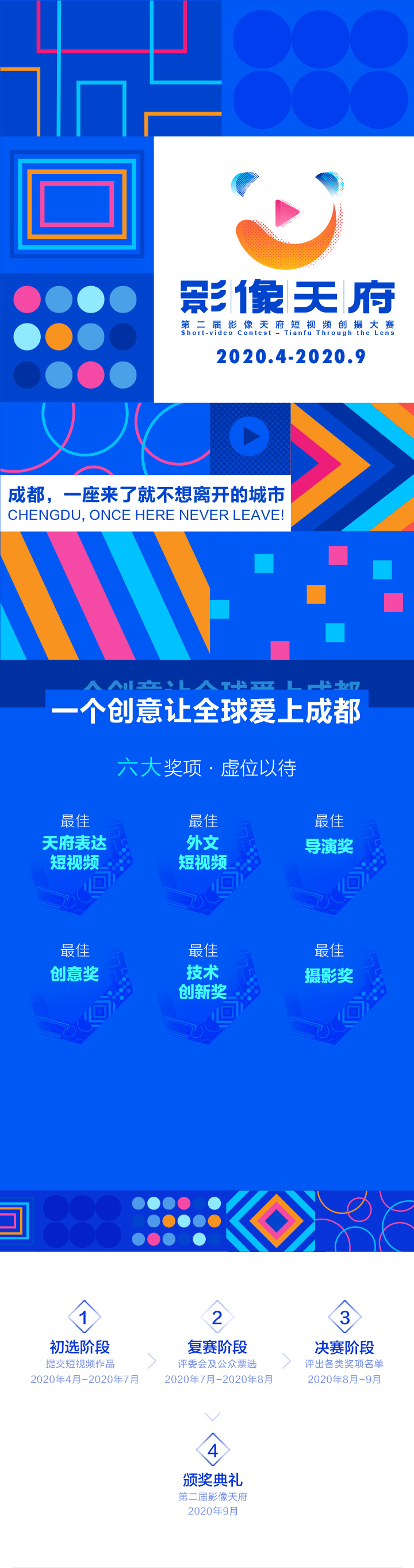 “第二屆影像天府·短視頻創(chuàng)攝大賽”于2020年4月正式啟動,邀約全球創(chuàng)攝愛好者續(xù)寫“成都,一座來了就不想離開的城市”篇章,征集優(yōu)質影像作品。本次大賽設置最佳天府表達短視頻、最佳外文短視頻、最佳導演獎、最佳創(chuàng)意獎、最佳技術創(chuàng)新獎、最佳攝影獎六大專業(yè)。評委包括中國電影家協(xié)會副主席,上海電影家協(xié)會主席任仲倫;艾美獎得主,美國著名影視導演、制片人Mark